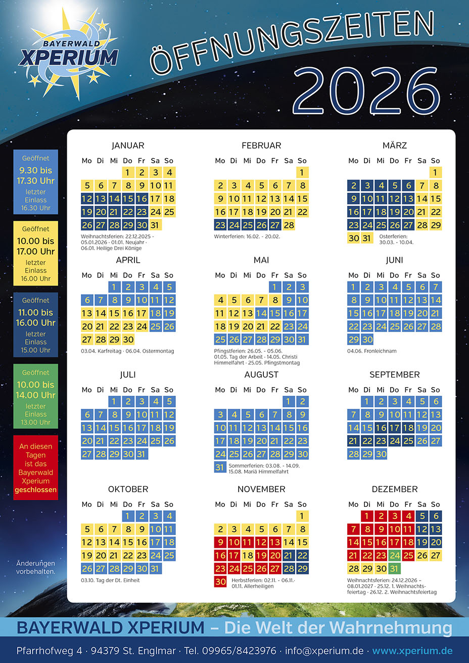 Dort sehen Sie für jeden einzelnen Tag die aktuell gültigen Zeiten auf einen Blick. Bitte orientieren Sie sich bei Ihrem Besuch immer am Kalender.